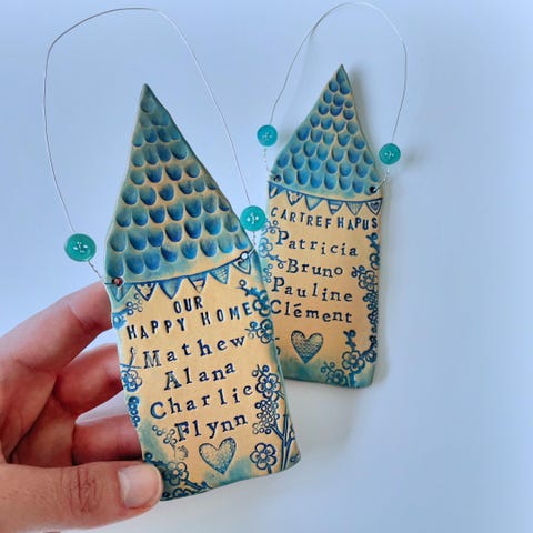 Come and make two ceramic houses. Using stoneware clay you will be gently led through the process of forming a house, and using a vast collection of stamps to write words and put images onto the house. Each participant will get to make two houses, which will be dried, fired and glazed after the workshop, and be delivered back to you 2-3 weeks later. They will be finished with a hanging wire and colour-coordinated buttons. These make a fantastic gift, so why not make one to keep and one to gift?
