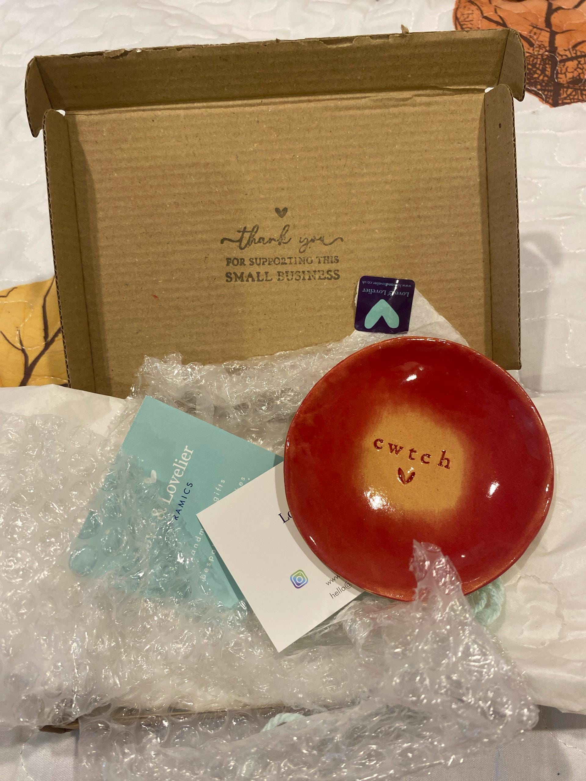 My sister gifted me the little red Cariad jewelry dish last Christmas. It was adorable so this year I gifted my friend in Wales one that said Cwtch. They really are lovely and well made. Recipient was delighted with it.