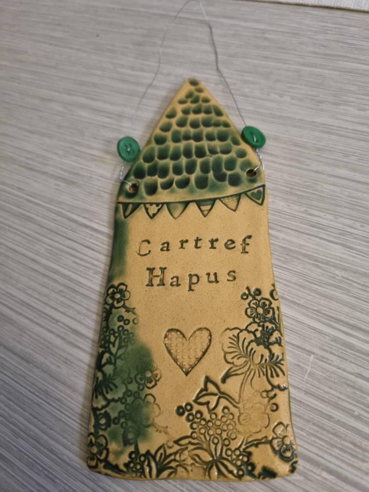 This a cute ceramic house shaped plaque strung with wire and vintage buttons for you to hang on the wall. It has the words: 'Cartref Hapus' imprinted into the clay, which means Happy Home in Welsh. After firing once to over 1000C, I then glaze it a cheerful red, soft greys, or glassy greens before firing for a second time.