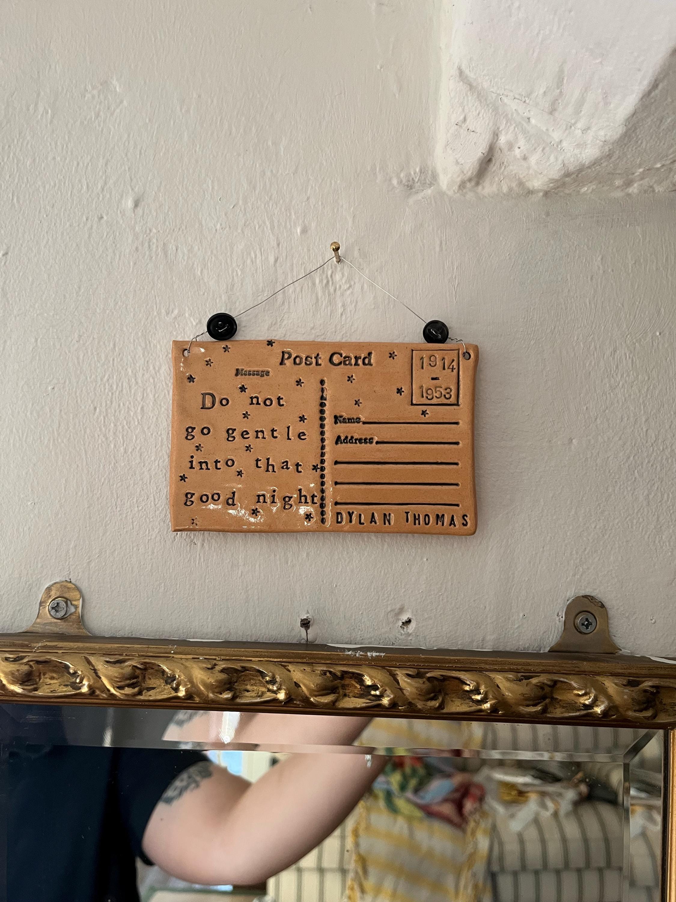 This is one of my Dylan Thomas (Welsh poet and playwright) ceramic postcards. This quote is from the the title of the poem of the same name. I individually press each letter in the damp clay, along with the little stars, before drying, and then firing the postcard to over 1000*C.